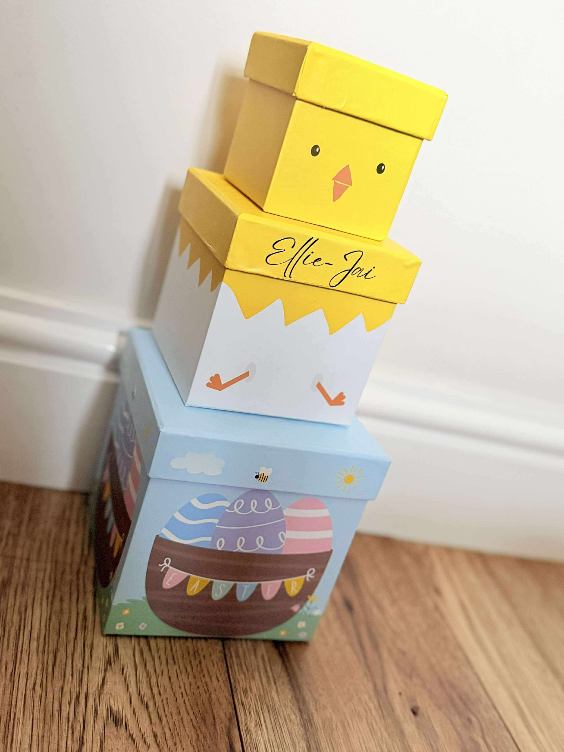 these 3pc easter theme stacking boxes which come personalised perfect for filling with mini easter treats 1st box h12xw12cm 2nd box h9.5xw9.5cm 3rd box h7xw7cm