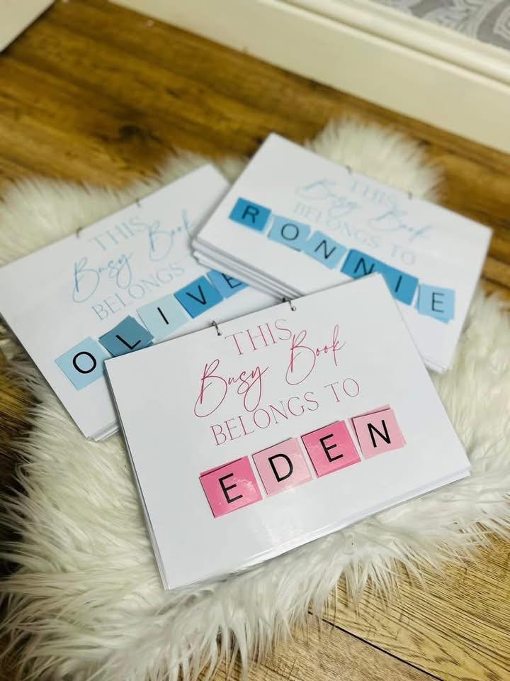 THESE PERSONALISED BUSY BOOKS WHICH ARE SUITABLE FOR 2-5 YEAR OLD CONTAINING TRACING, PAIRING, MATCHING, SORTING INTO ORDER. THESE ARE PERFECT FOR A LITTLE ACTIVITY OR KEEPING ENTERTAINED ON THE GO.