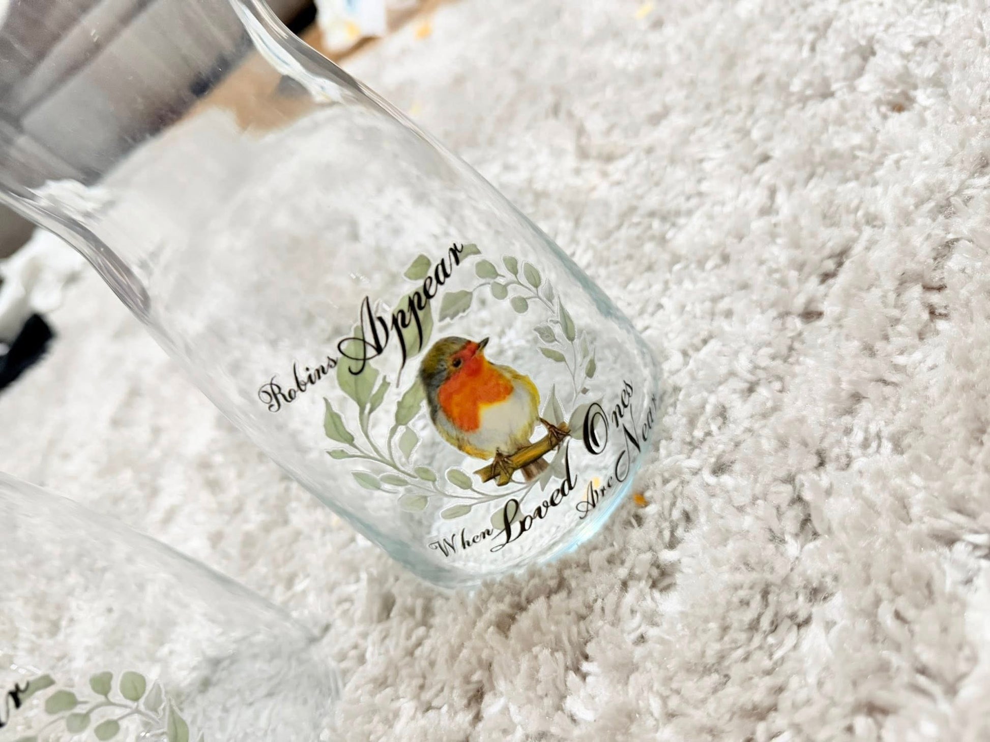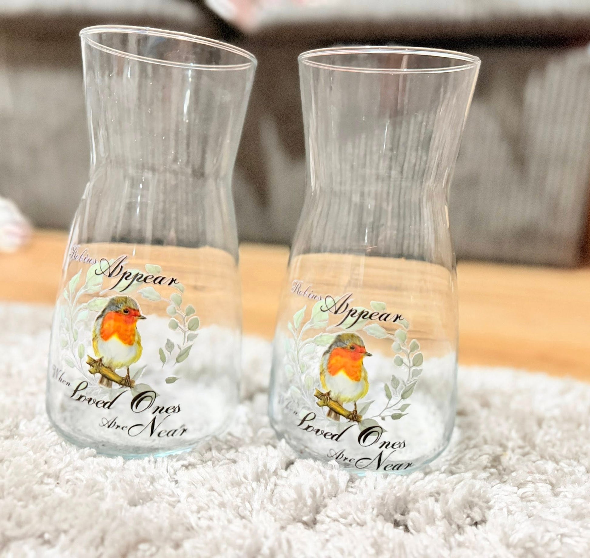 THESE GLASS VASES WHICH COME WITH THE ROBIN DESIGN THAT HAS THE WRITING ROBINS APPEAR WHEN LOVED ONES ARE NEAR.